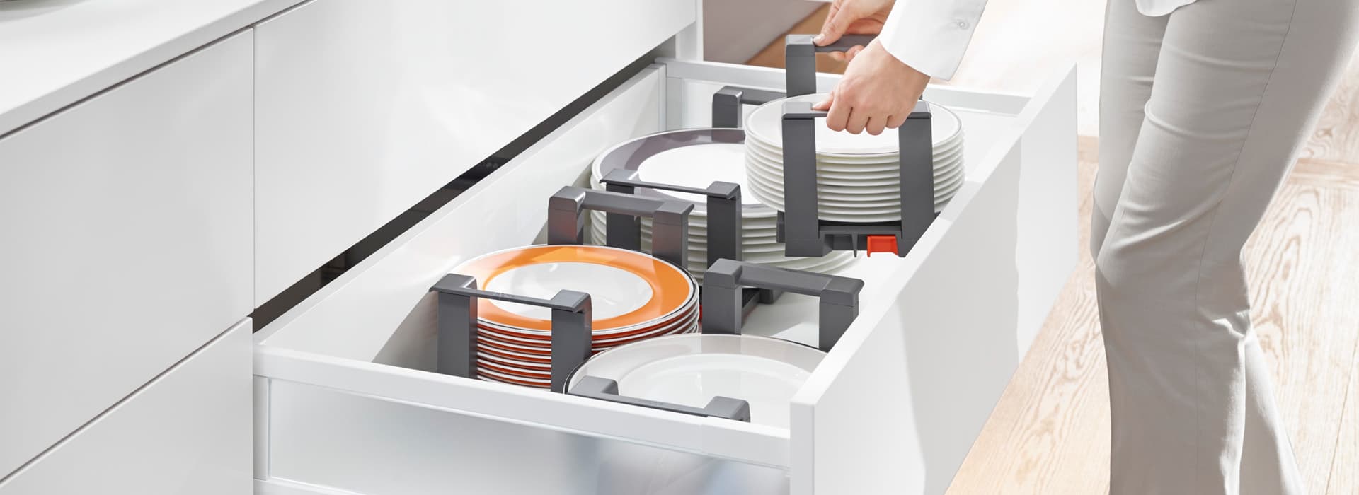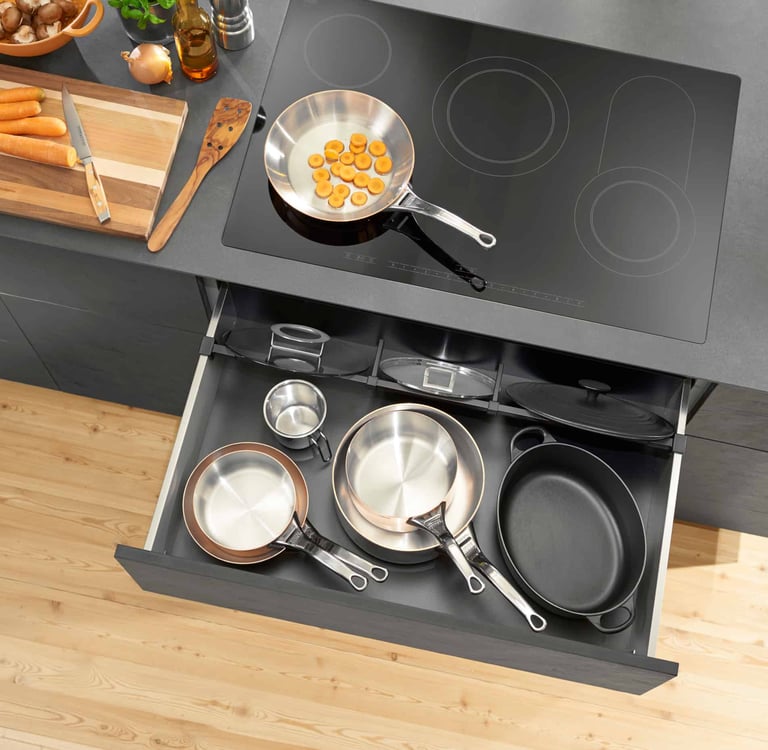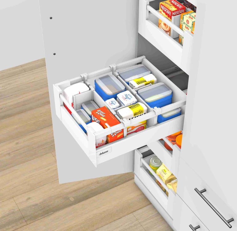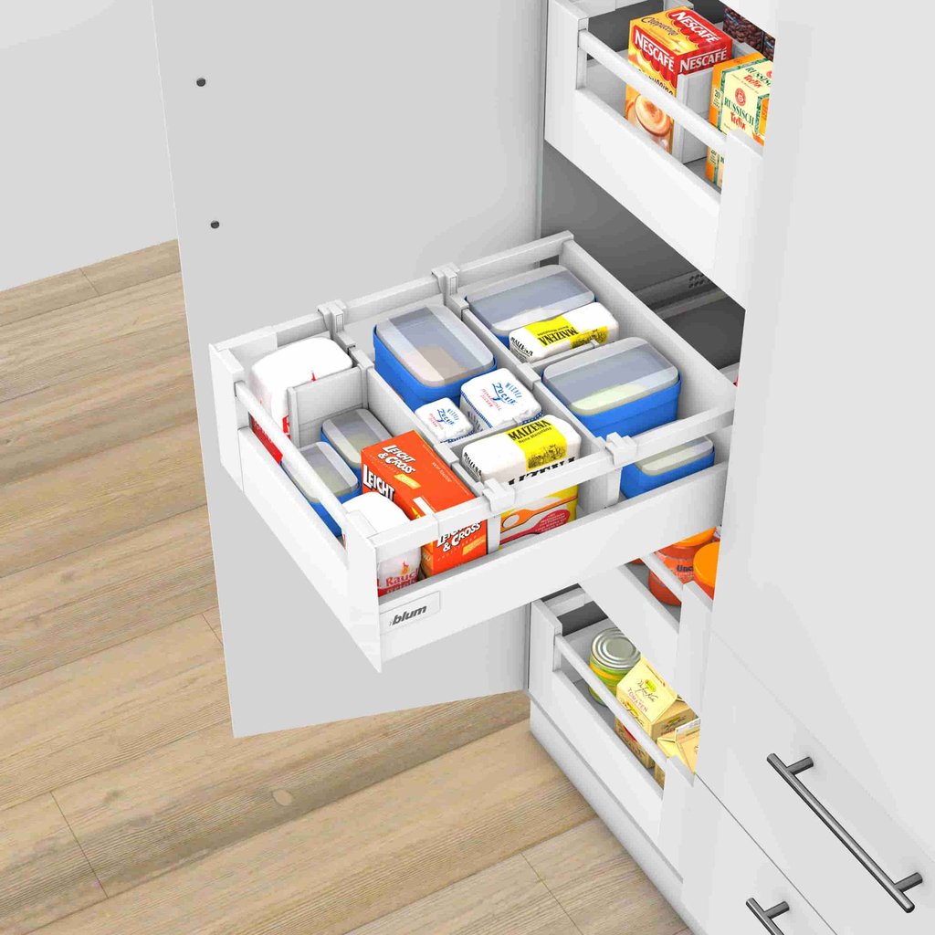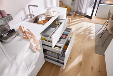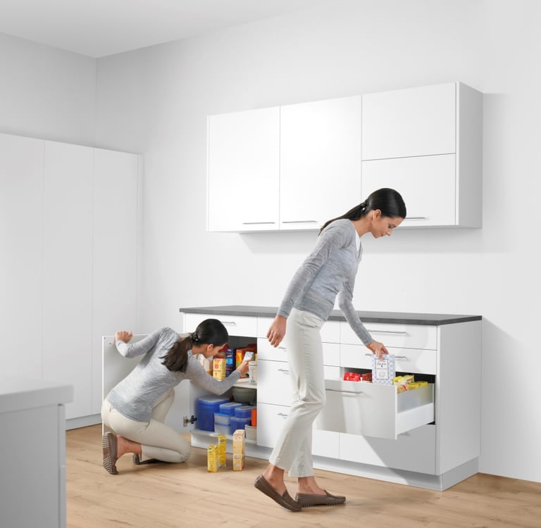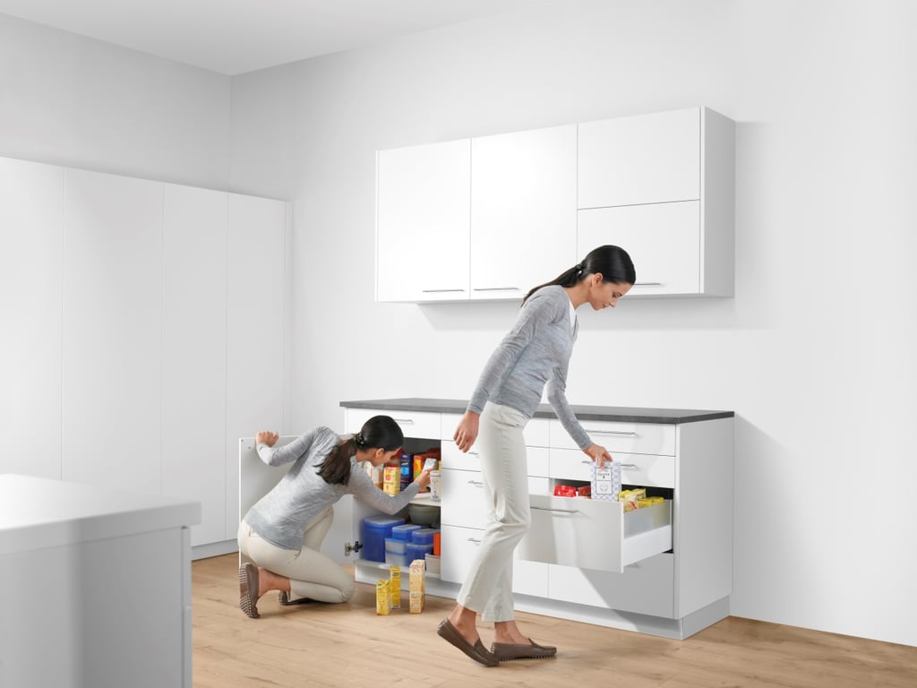 Em comparação com os módulos com extensões, as portas convencionais dificultam a procura nos móveis, uma vez que é necessário baixar-se e virar-se para encontrar o que procura. O que está armazenado lá no fundo acaba geralmente por ser esquecido. O conteúdo acaba por ficar desorganizado.