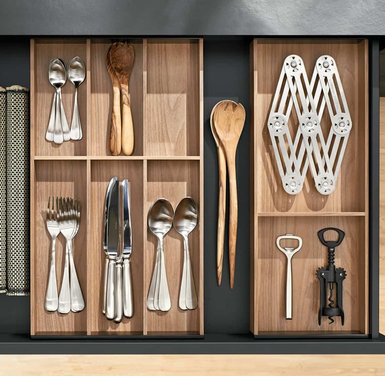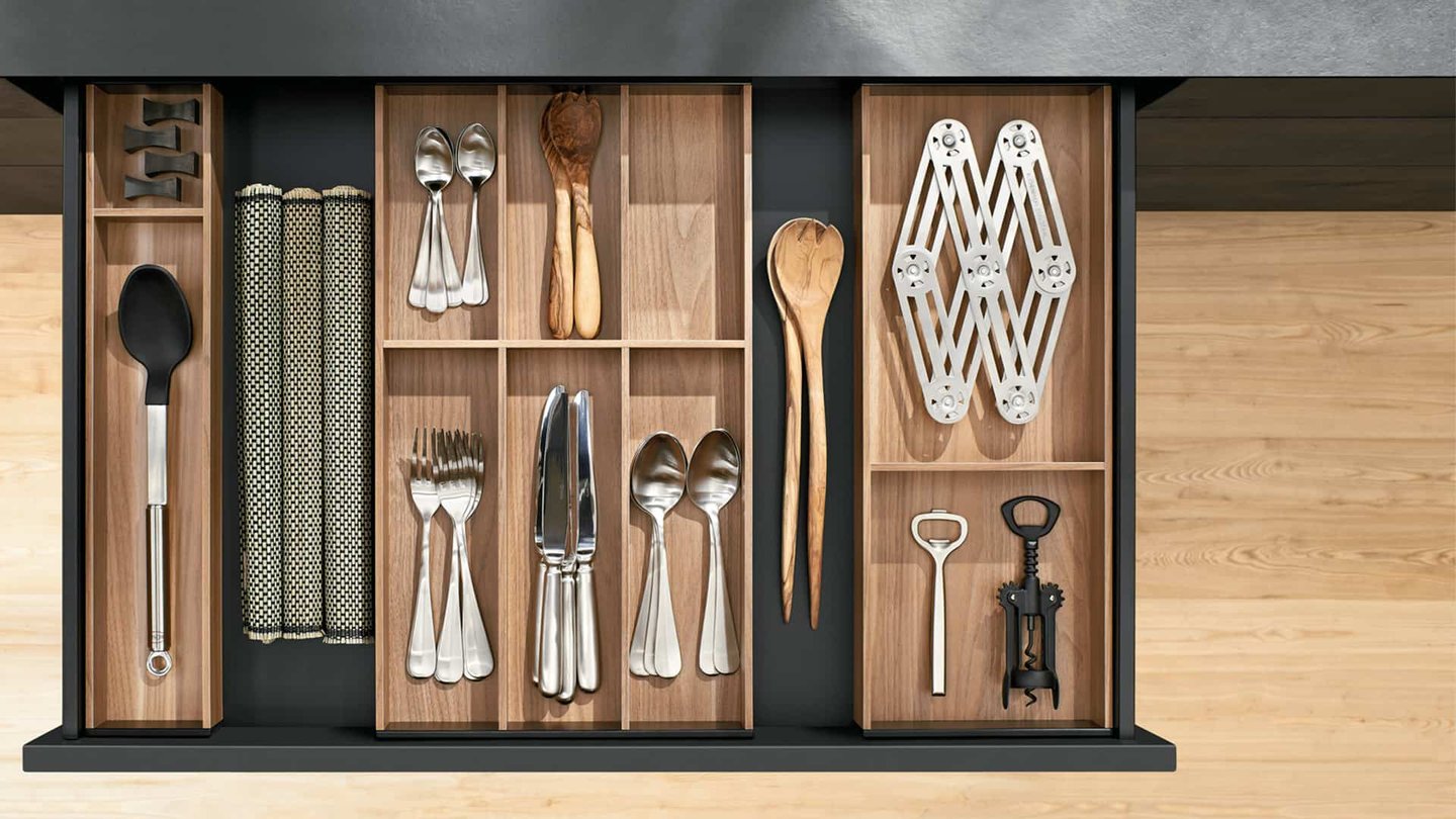 Os talheres ficam muito bem organizados numa gaveta alta graças aos organizadores internos. Com este sistema de divisões internas, tudo pode ser adaptado.