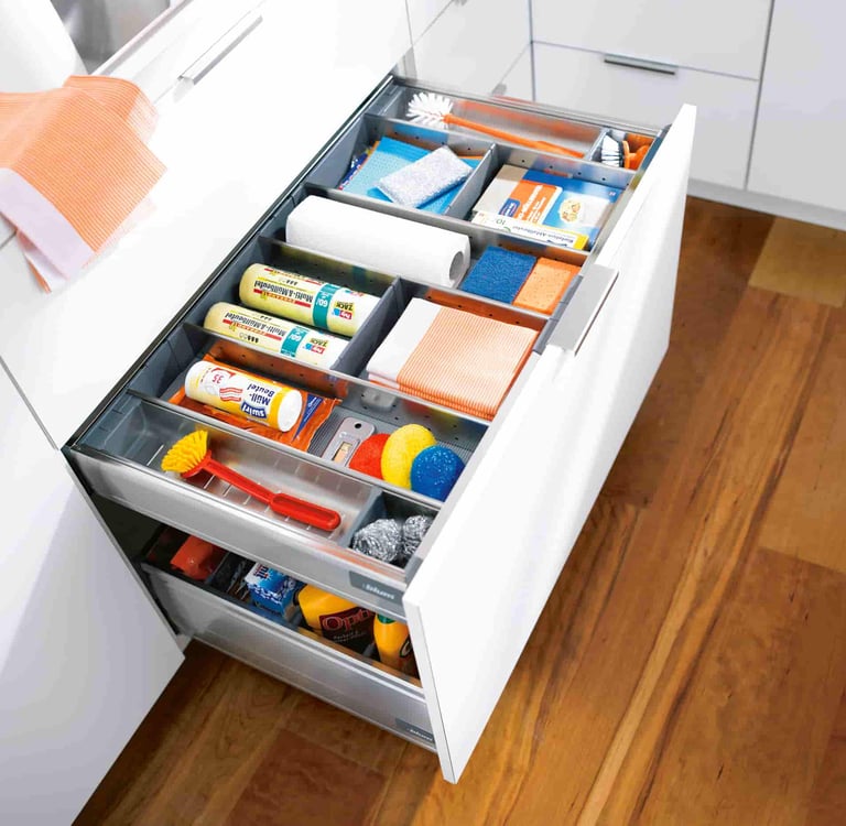 Os utensílios de limpeza podem ser convenientemente armazenados debaixo do lava-loiça com esta solução compacta, onde todo o espaço é totalmente utilizado. E tudo é fácil de remover e de alcançar.