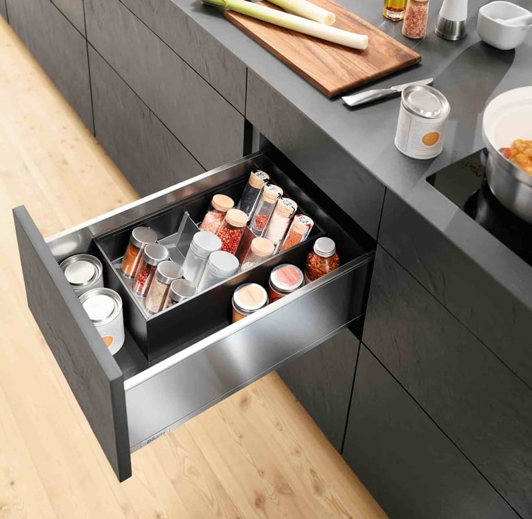 Os módulos com extensão total e as gavetas internas proporcionam uma configuração compacta, ideal para uma utilização com economia de espaço. Sempre conjugado com divisões internas.